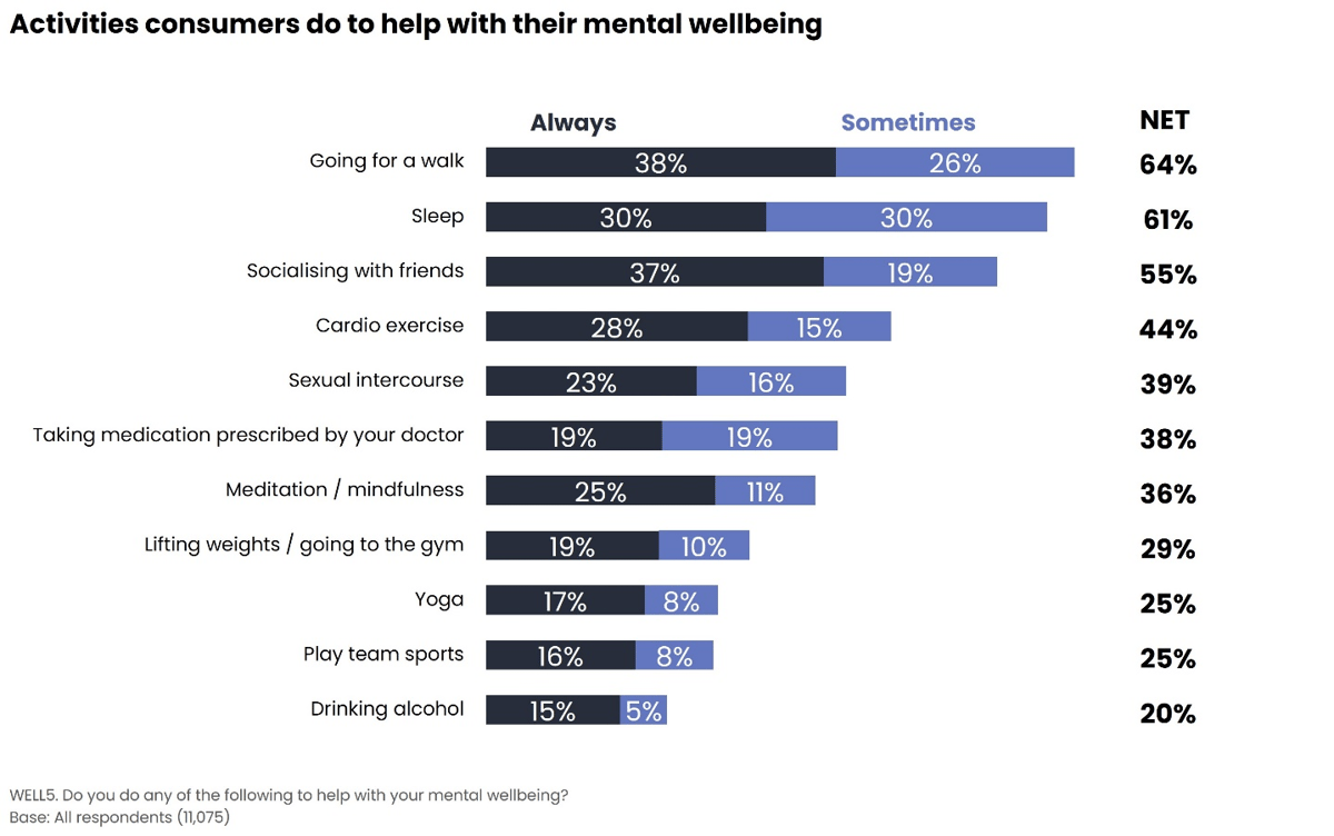 Medical assistance remains an integral part of mental well-being strategies, with 38% of consumers relying on doctor-prescribed medication to aid their mental health. The country where this is most likely to be the case is the US (52%).